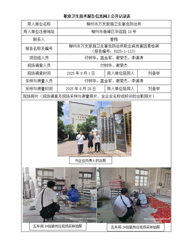 柳州市萬友家庭衛(wèi)生害蟲防治所職業(yè)病危害因素檢測(cè) (報(bào)告編號(hào):YQ25-1-113)