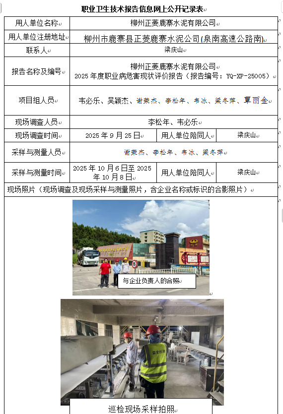 柳州正菱鹿寨水泥有限公司 2025年度職業(yè)病危害現狀評價報告