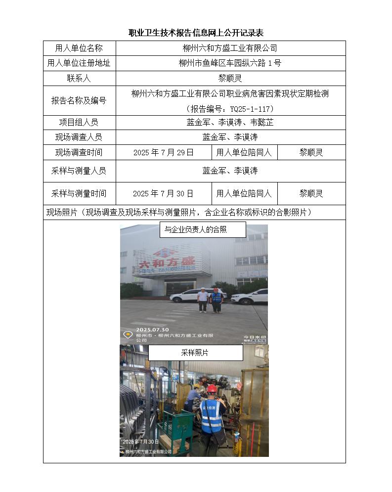 柳州六和方盛工業(yè)有限公司職業(yè)病危害因素現(xiàn)狀定期檢測 (報告編號:YQ25-1-117)